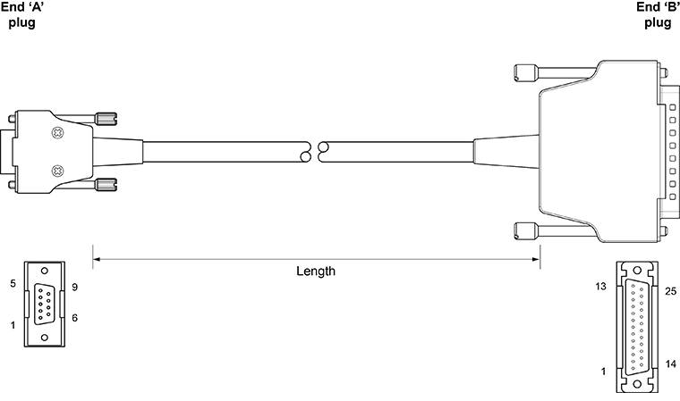 This straight cable has a 9-pin D-type plug at end 'A' and a 25-pin D-type plug at end 'B'. It is used to relay emergency stop (E-STOP) signals between the SPA2 servo power amplifier and UCC2 universal controller.