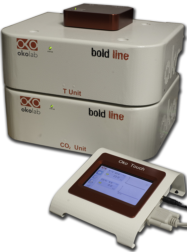 The Okolab stage top incubator system is suitable for Raman imaging of live cells on an upright microscope. The Okolab system controls the temperature, gas and humidity environment of thebiological sample.