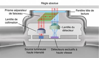 Le mouvement d’axe linéaire entraîne la tête de lecture et les éléments optiques à travers la règle absolue du codeur (qui est fixée à l’intérieur du logement), sans contact mécanique.
