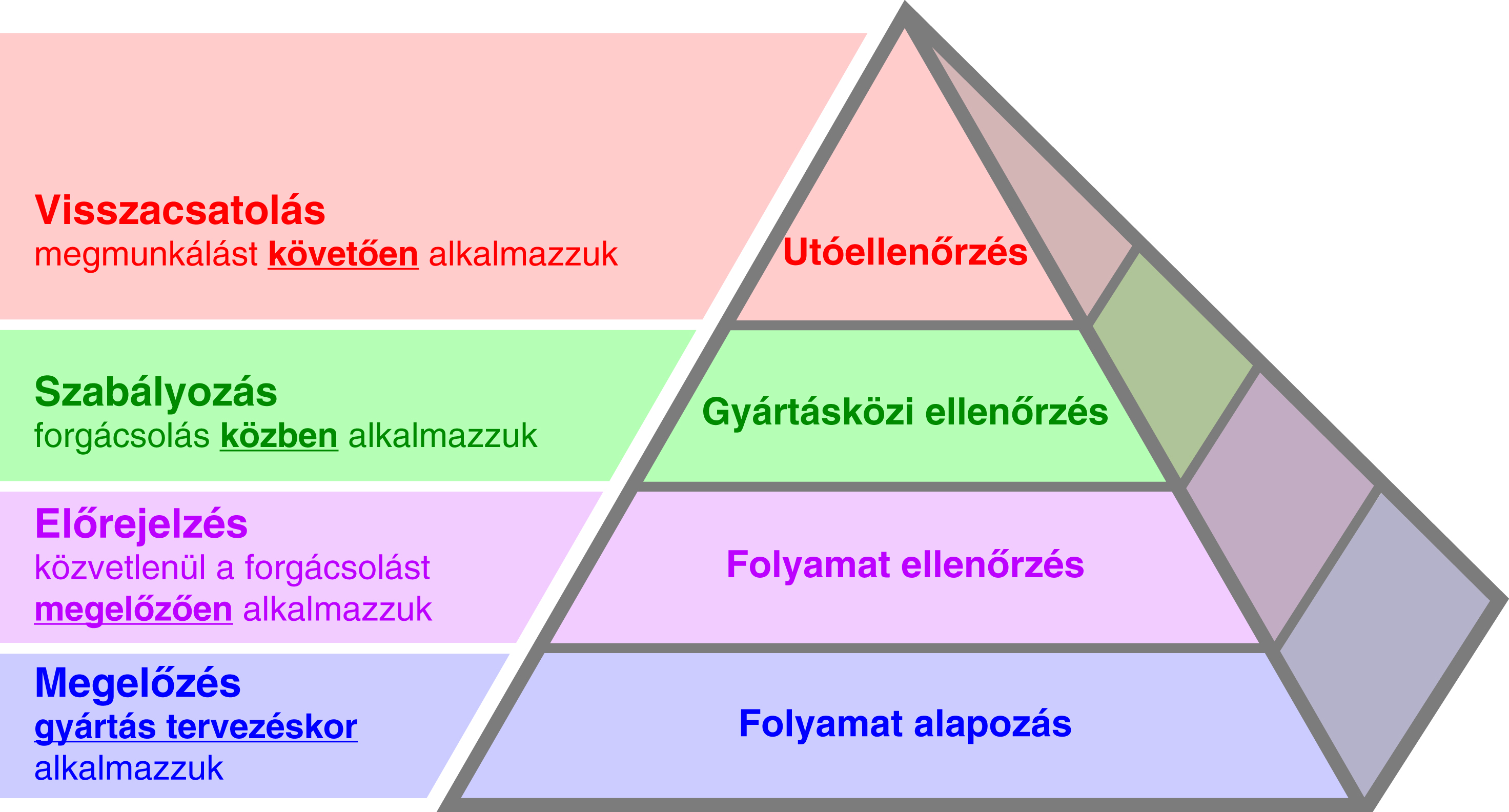 A Renishaw termelési folyamatpiramisa™ a gyártás minden fázisában keretet biztosít a folyamatszabályozási tevékenységek meghatározásához. A szabályozás különféle szintjei révén az eltérések szisztematikusan kiiktathatók a megmunkálási folyamatból, mely segít az elfogadható, tűréshatáron belüli munkadarabok biztosításában.
