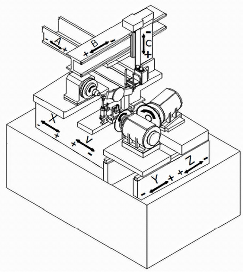 A kinematic feature of this machine is that the workpiece spindle axis (X-axis) and the V-block axis (V-axis) are on the same linear motor guideway but driven by separate linear servo motors.