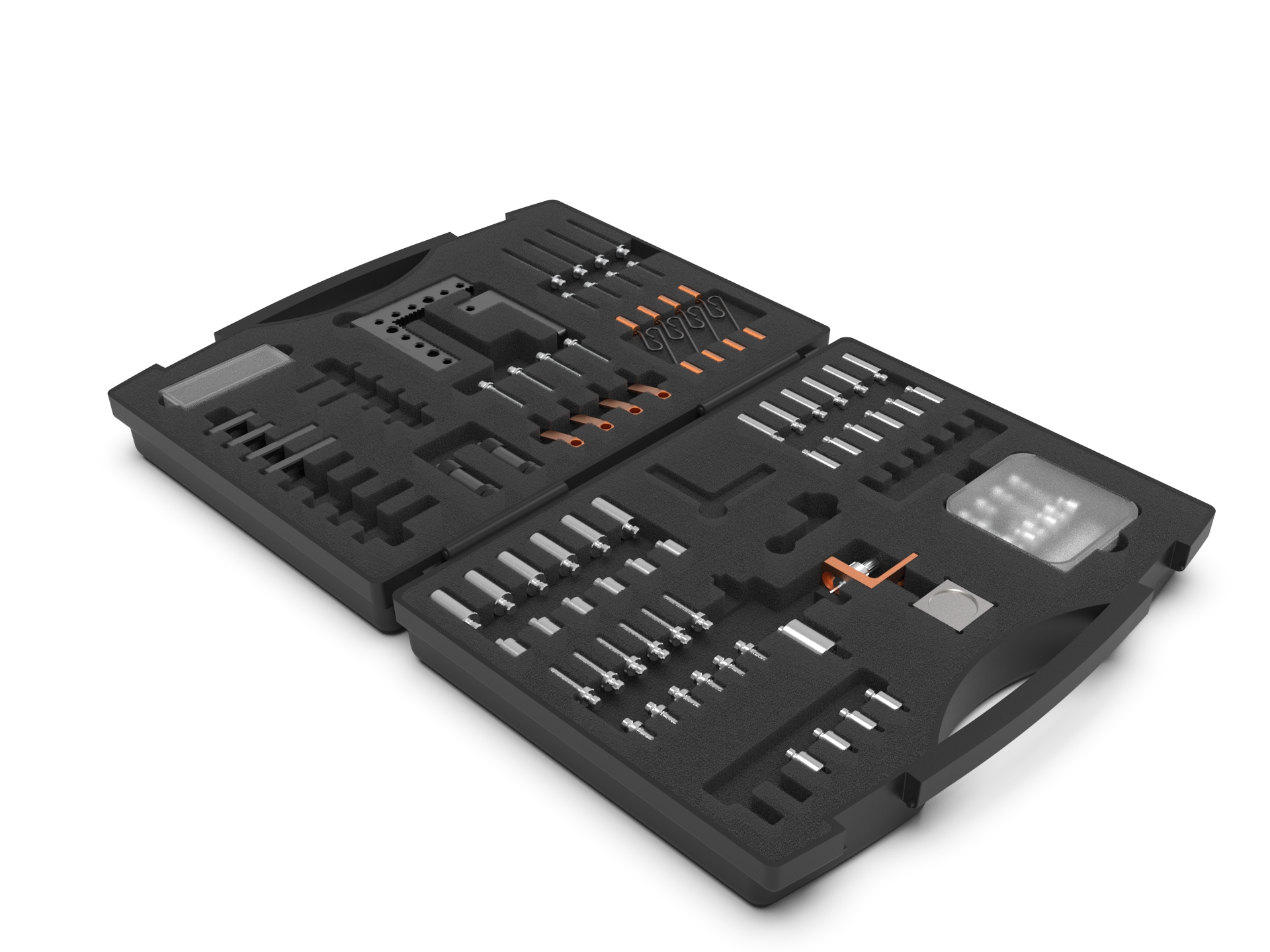 Each fixturing component set comes in a protective carry case for safe transportation and to provide storage.